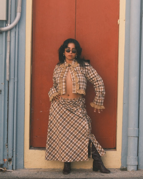 Brown Plaid Midi Wrap Skirt by Carmen Says